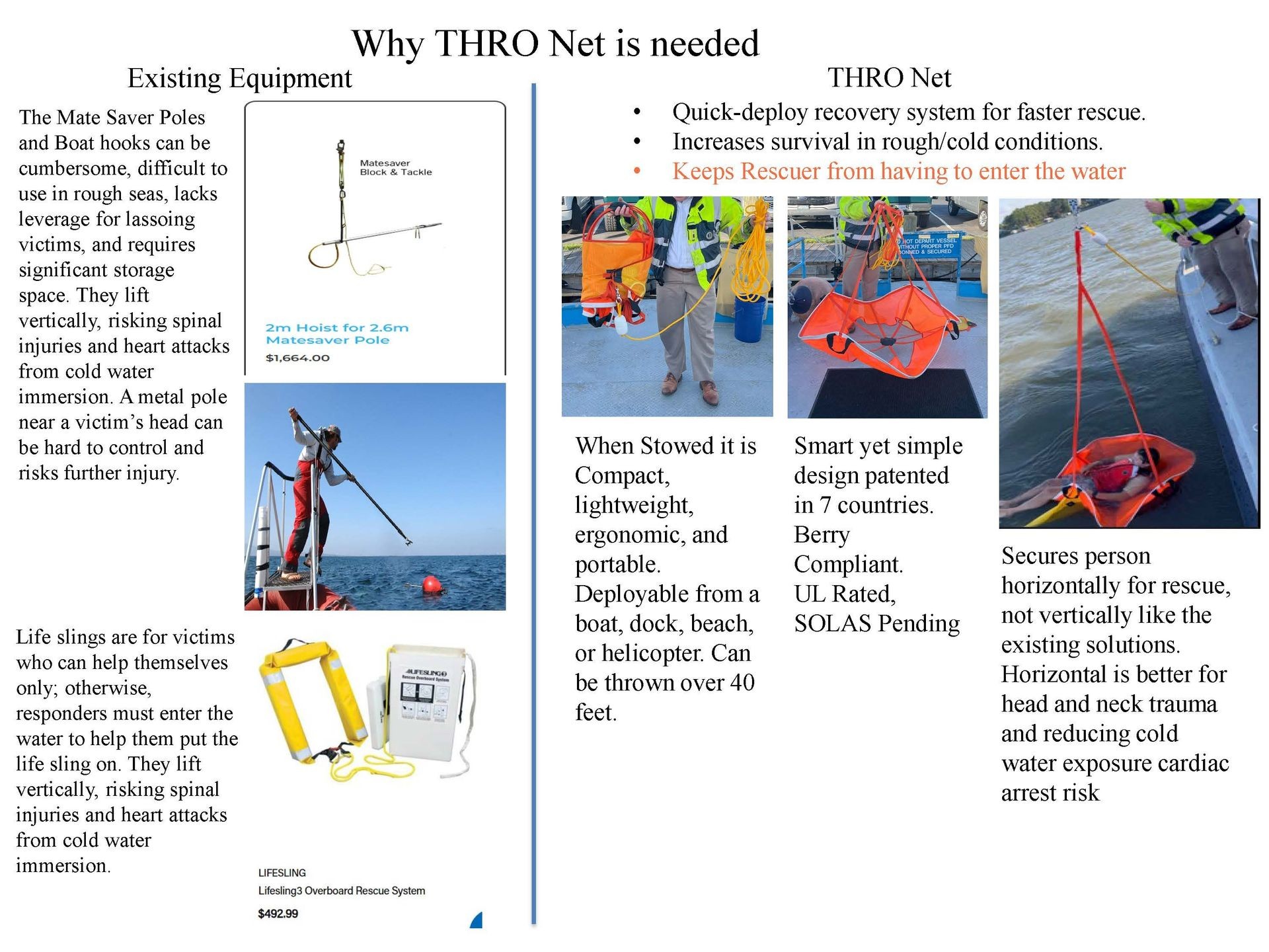 The THRO-Net is designed to assist rescuers in quickly and safely retrieving unresponsive or responsive persons without putting the First Responder in harm's way by getting into the water, enhancing overall safety in marine environments